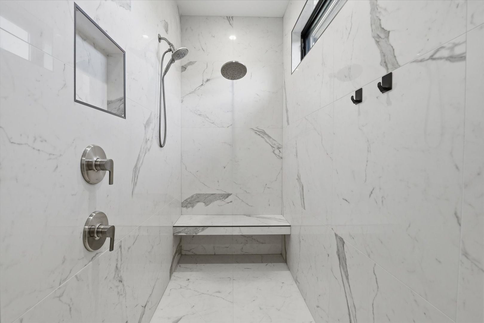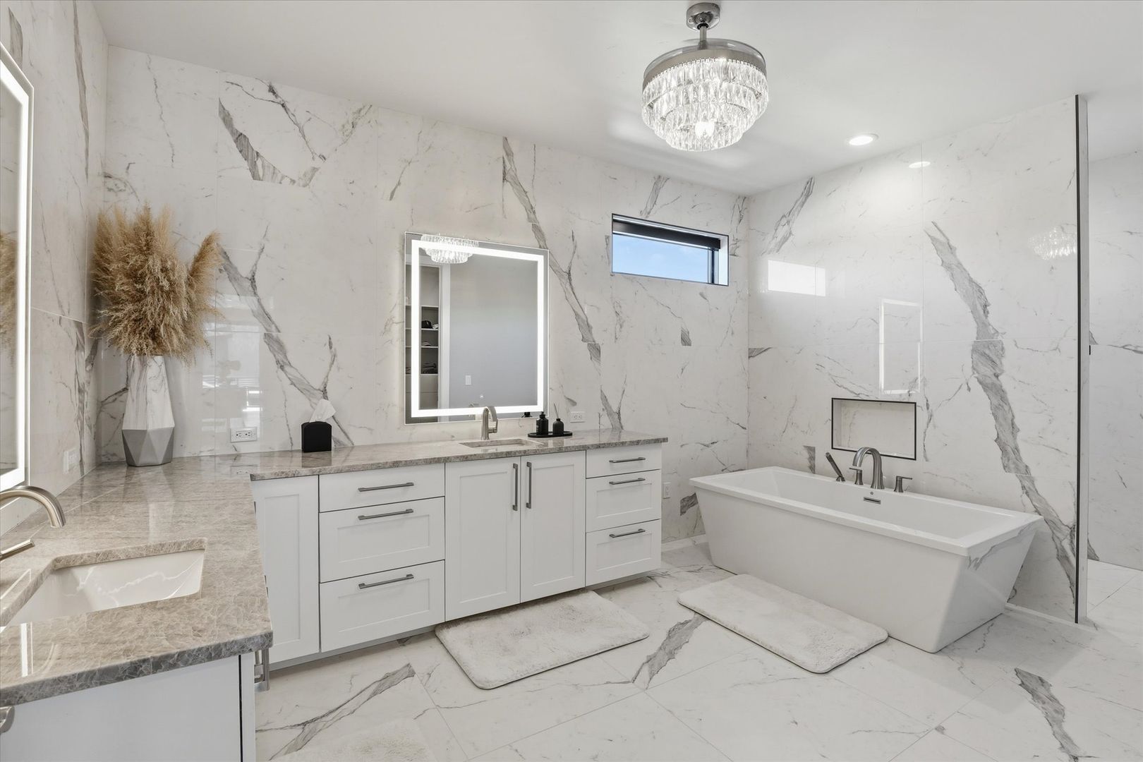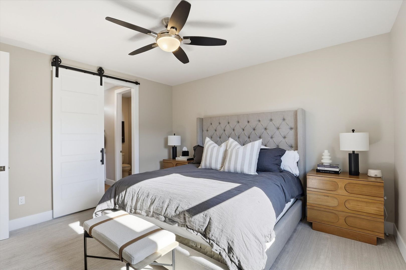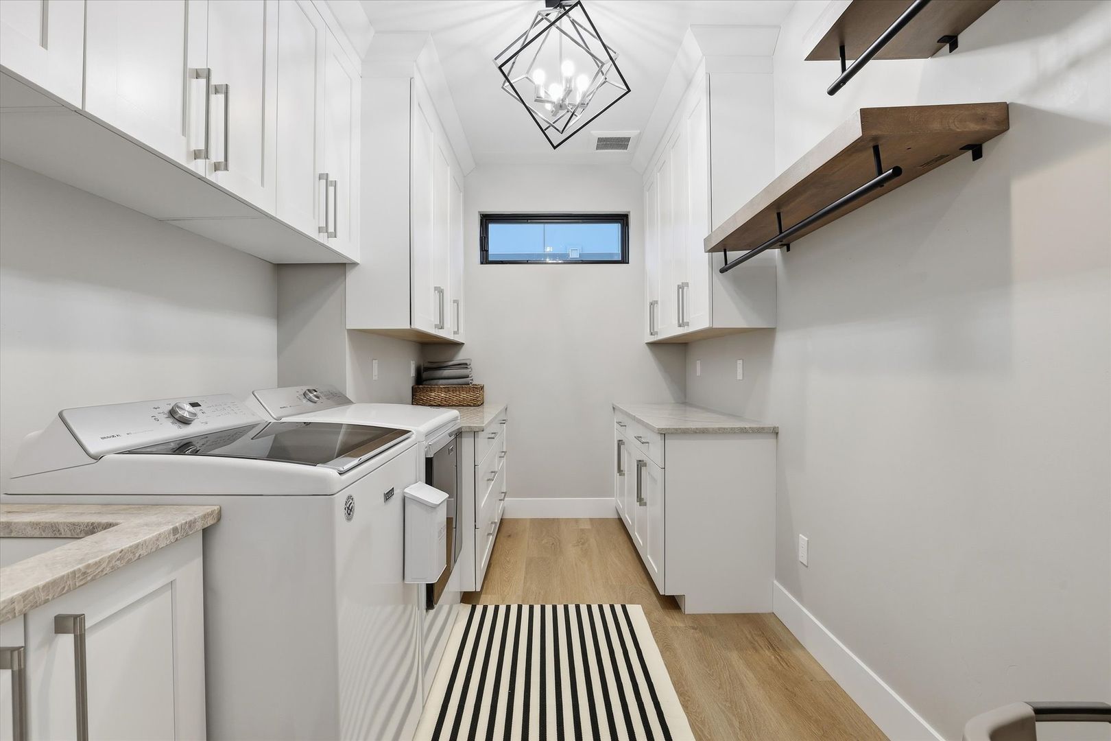 Upstairs, the luxurious primary suite offers a walk-in closet and a beautifully finished bathroom with tile accents and modern fixtures. Two additional bedrooms, a full bathroom, and a conveniently located laundry room complete the upper level.