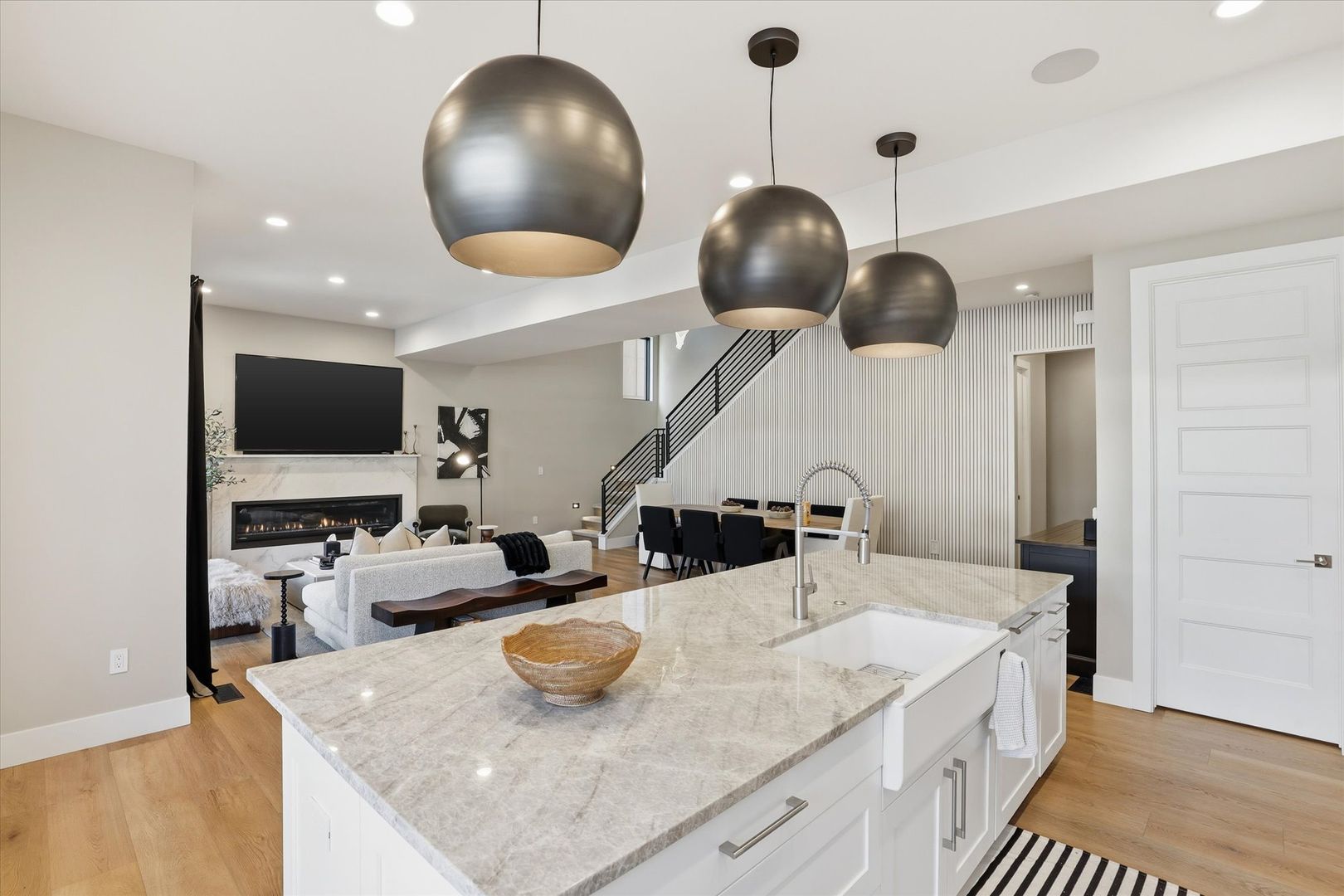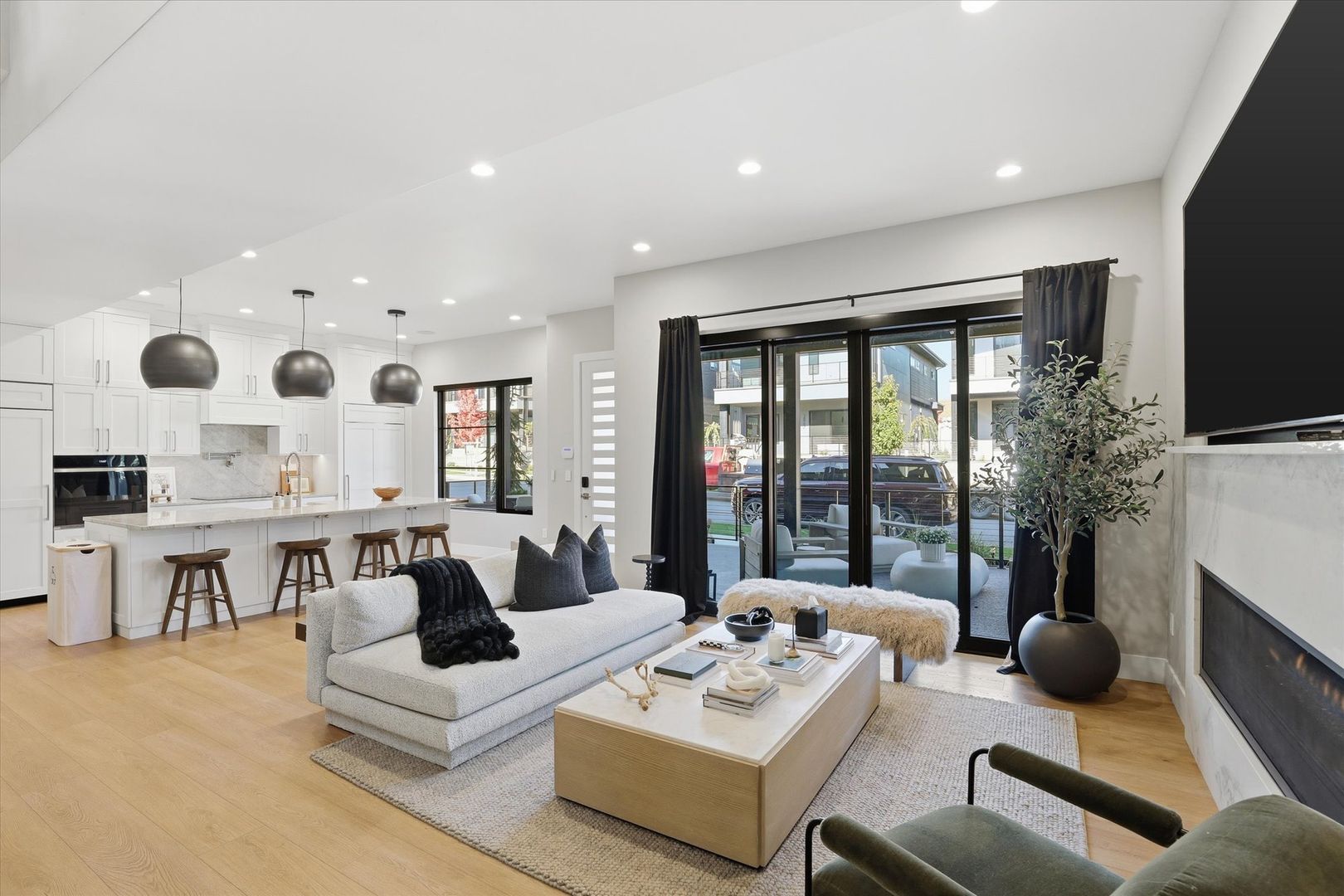 The main floor features a spacious, light-filled living area with tall ceilings, upgraded flooring, and large windows that enhance the home’s modern aesthetic. The gourmet kitchen includes quartz countertops, stainless steel appliances, sleek cabinetry, and an oversized island—perfect for cooking, gathering, and entertaining. A private outdoor patio extends your living space and provides the ideal place to relax year-round.
